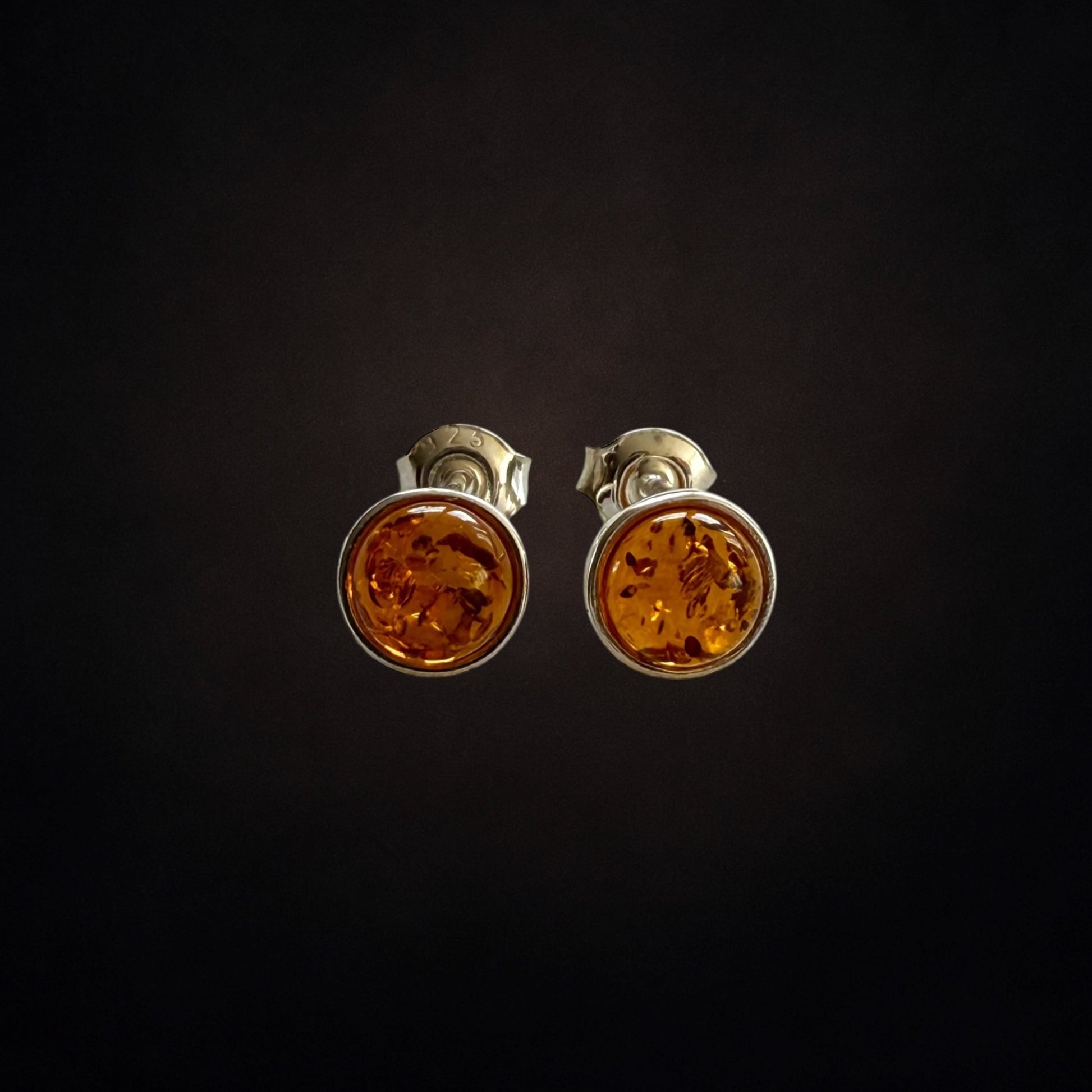 A timeless pair of round stud earrings handcrafted from sterling silver and set with genuine Baltic amber in a warm brown hue. The amber rests in a smooth silver bezel, offering a subtle balance of simplicity and natural beauty.