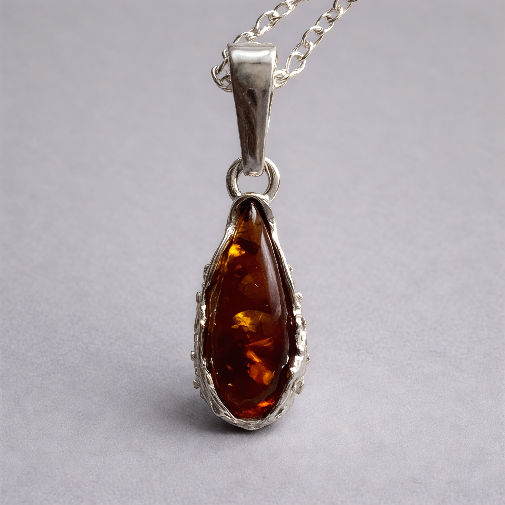 A delicate and timeless teardrop pendant featuring genuine Baltic amber in a rich cognac hue. The amber is set in a detailed sterling silver bezel that adds subtle texture and depth, while the smooth, polished stone catches the light beautifully. Suspended from a classic sterling silver chain, this piece is perfect for everyday elegance or special occasions.