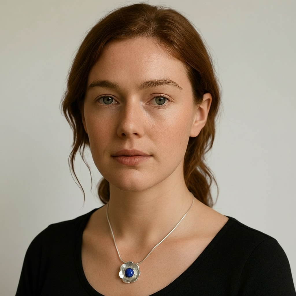 Handmade sterling silver flower pendant with lapis lazuli. This artisan pendant is entirely handmade in sterling silver using traditional silversmithing techniques such as hand sawing, texturing, soldering, filing, setting the stone and polishing.