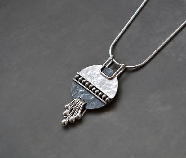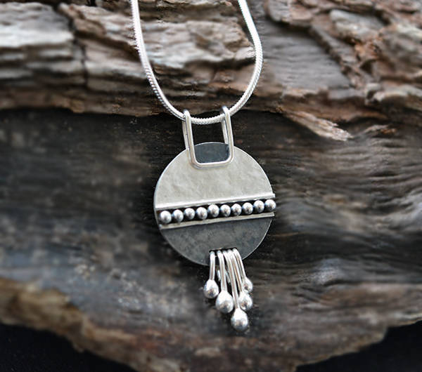 This necklace is entirely made by hand from 925 sterling silver. The pendant is hand-sawn from sterling silver sheet, textured, soldered, partially oxidised for contrast, and polished to a soft shine.