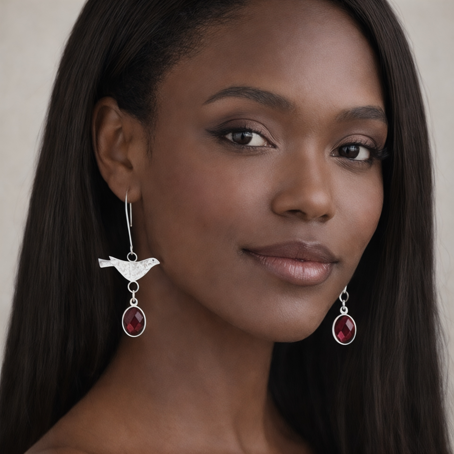 Handmade Sterling Silver Bird and Garnet Dangle Earrings – January Birthstone
