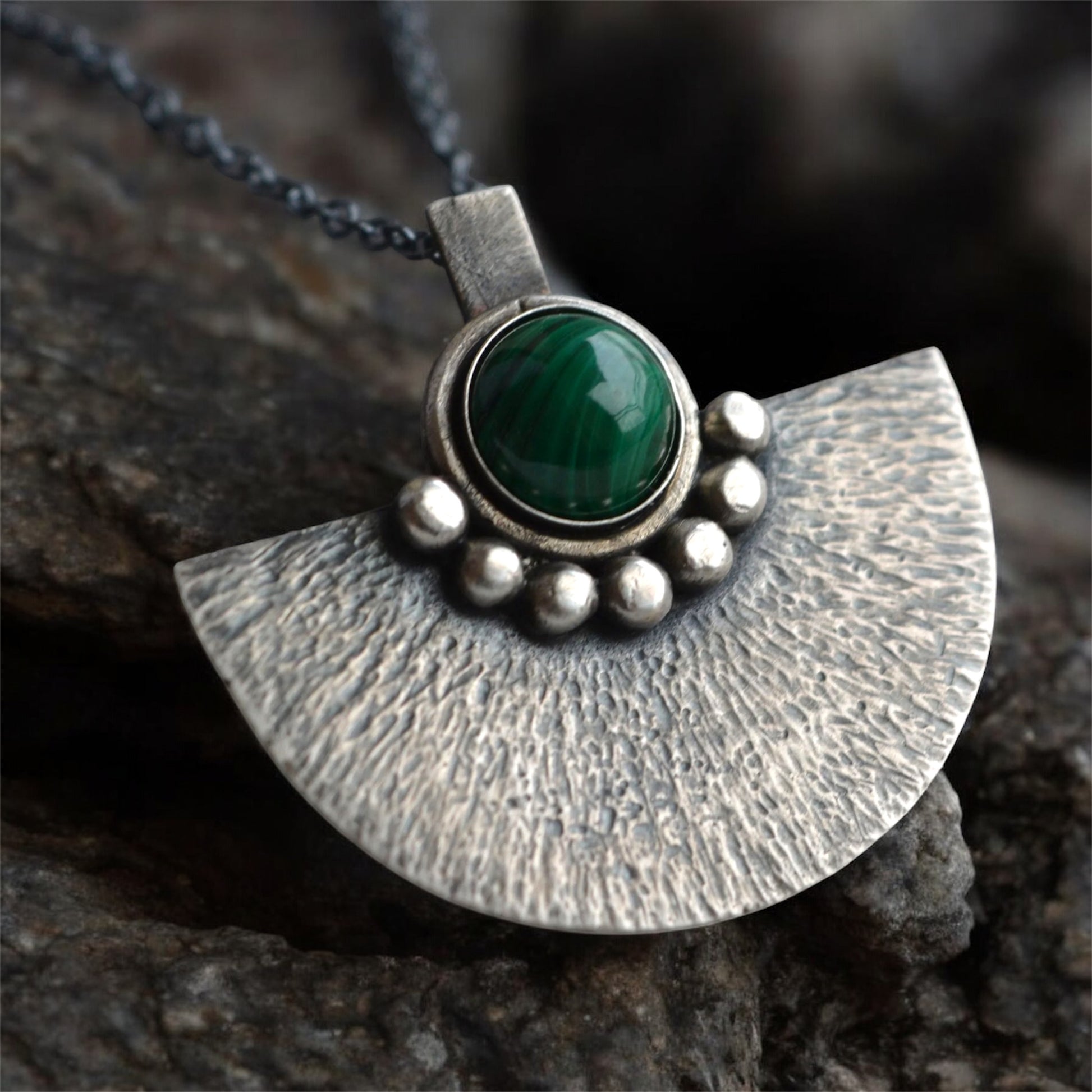 This pendant with green malachite is completely handmade in sterling silver, using traditional silversmithing techniques.The pendant has been hammered for a texture, oxidised and polished. The pendant hangs on a sterling silver oxidised chain which can be easily taken off.