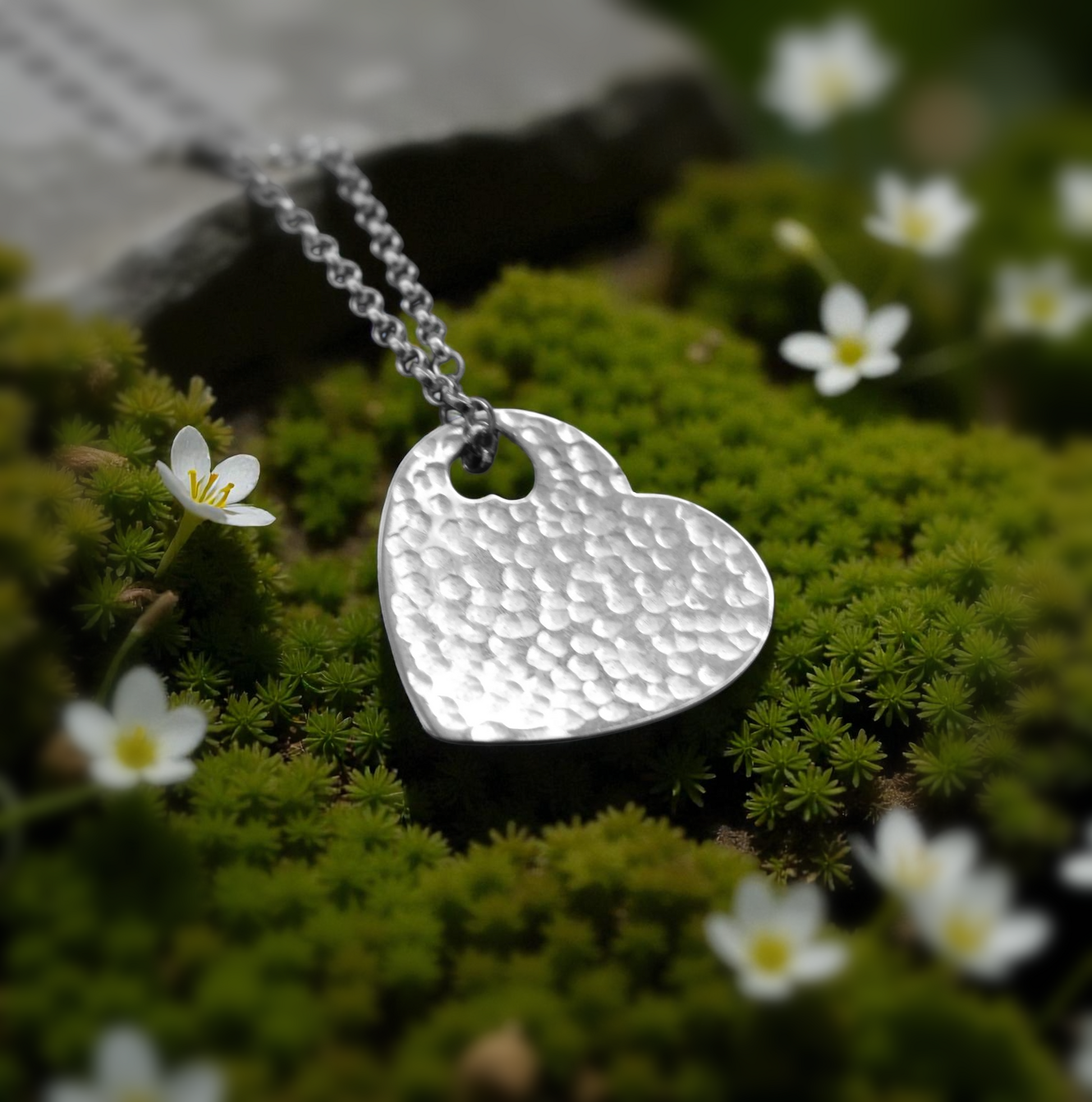 A simple yet stylish sterling silver heart necklace. The heart pendant has been hammered to create the lovely dimpled finish which catches the light and glitters.