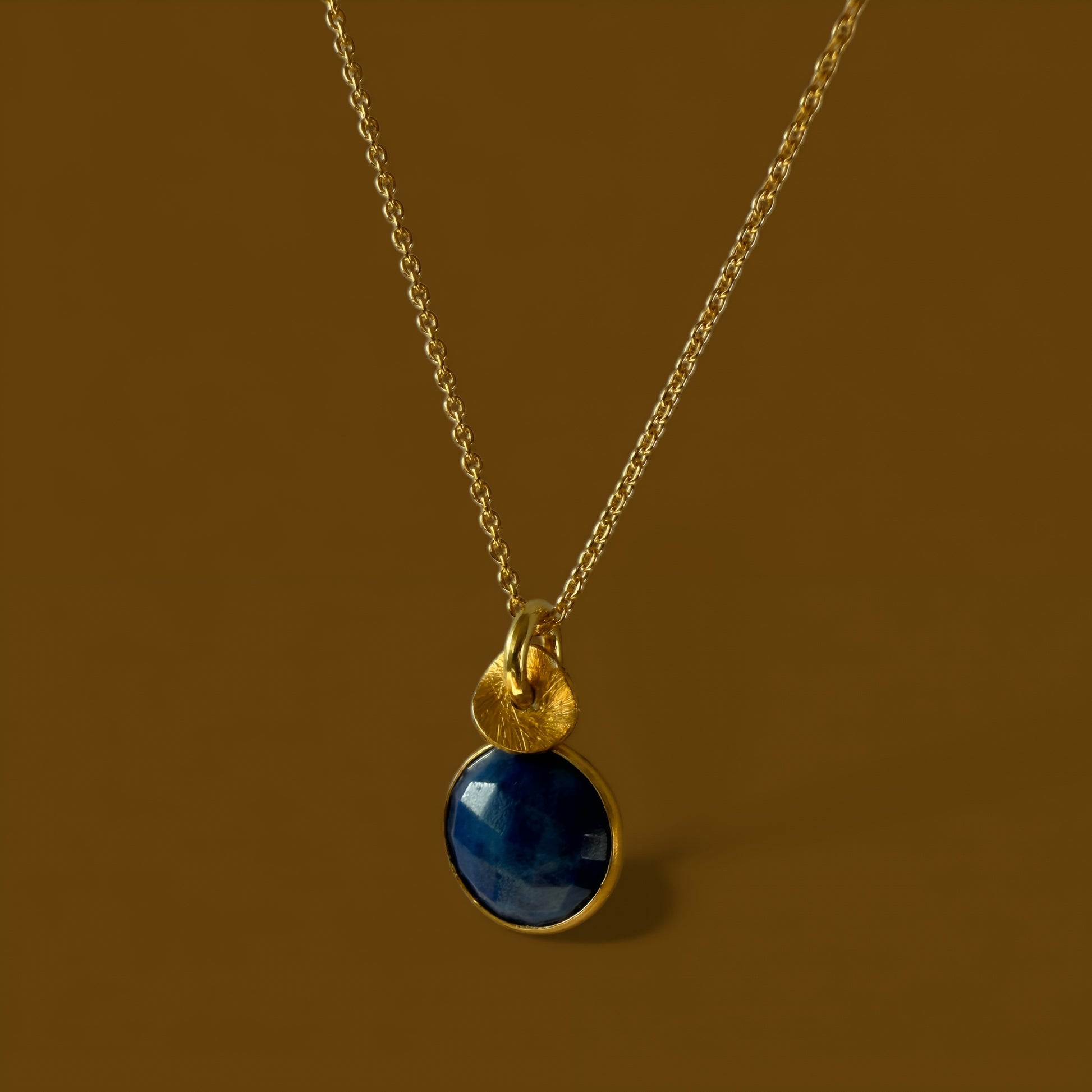 This elegant necklace features a natural lapis lazuli gemstone set in luxurious 24k gold vermeil, a thick layer of gold over solid sterling silver. The simple setting highlights the deep blue tones within the stone, creating a timeless and refined piece.