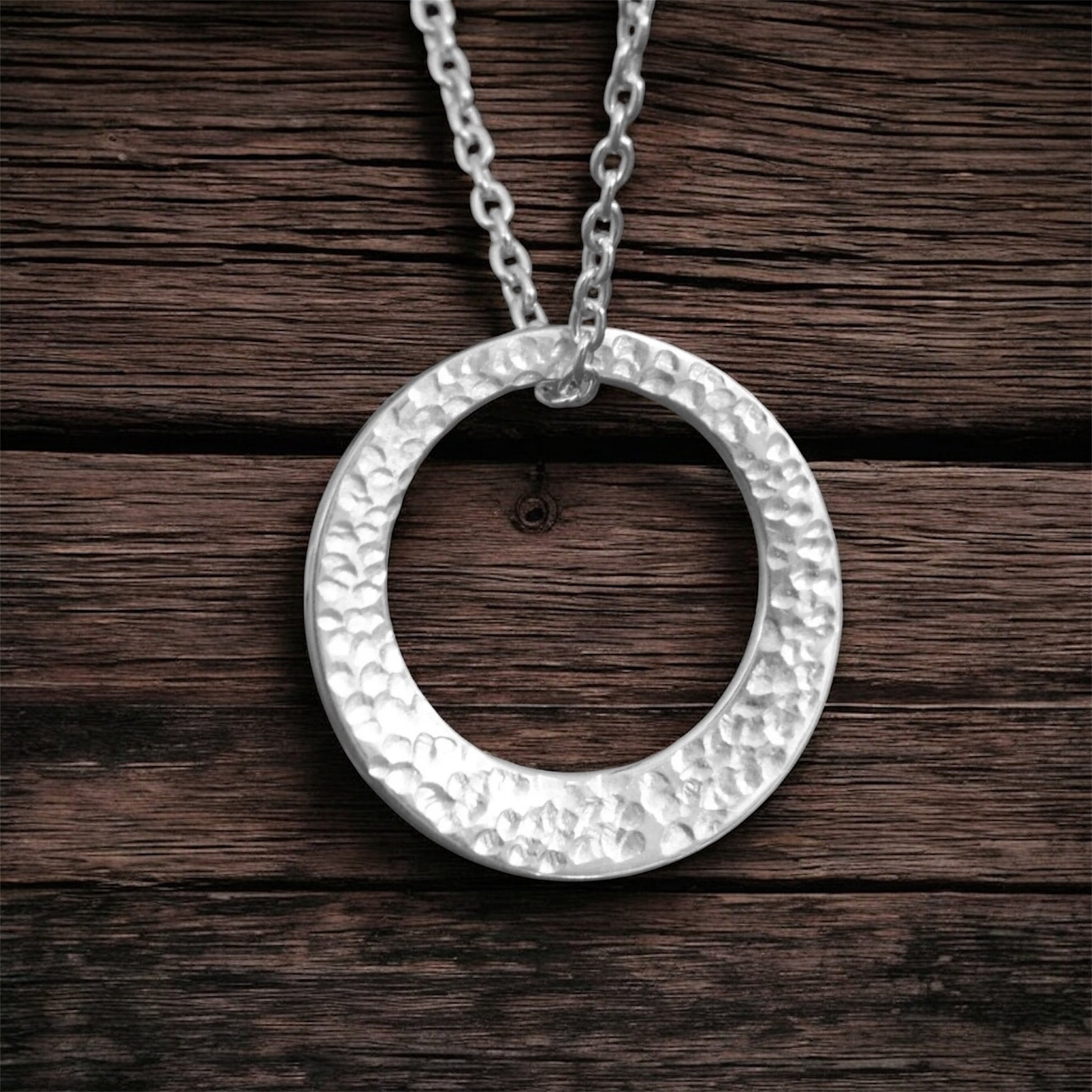 This sterling silver washer pendant looks great on its own or layered with other necklaces. It has been hammered to create a modern design. It hangs on a sterling silver trace chain.