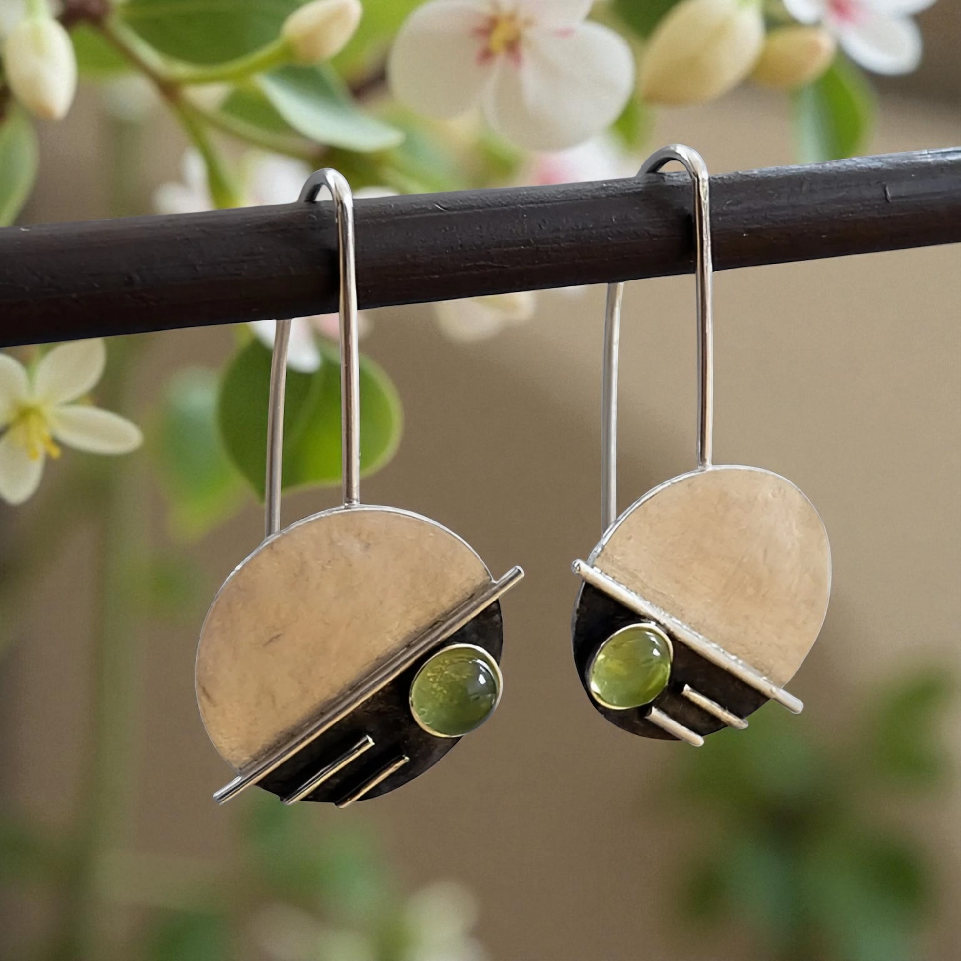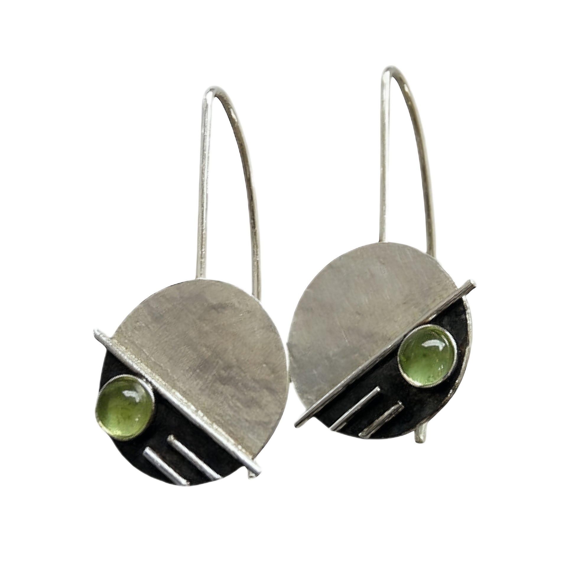 These contemporary earrings with Peridot are entirely handmade in sterling silver. They have been textured, partially oxidised and polished to a bright and shiny finish.