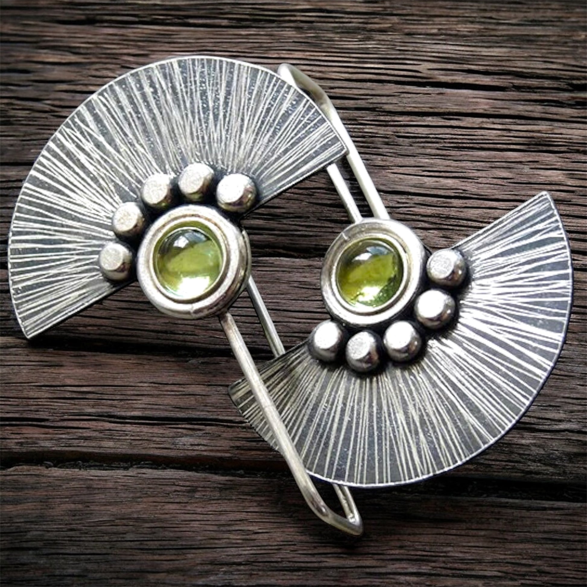 These fan-shaped earrings are entirely handmade from scratch using traditional silversmithing techniques. Each piece is crafted with care, hand sawn from sterling silver sheet, then soldered, textured, and set with green natural peridot stones. The silver has been partially oxidised to enhance the contrast.