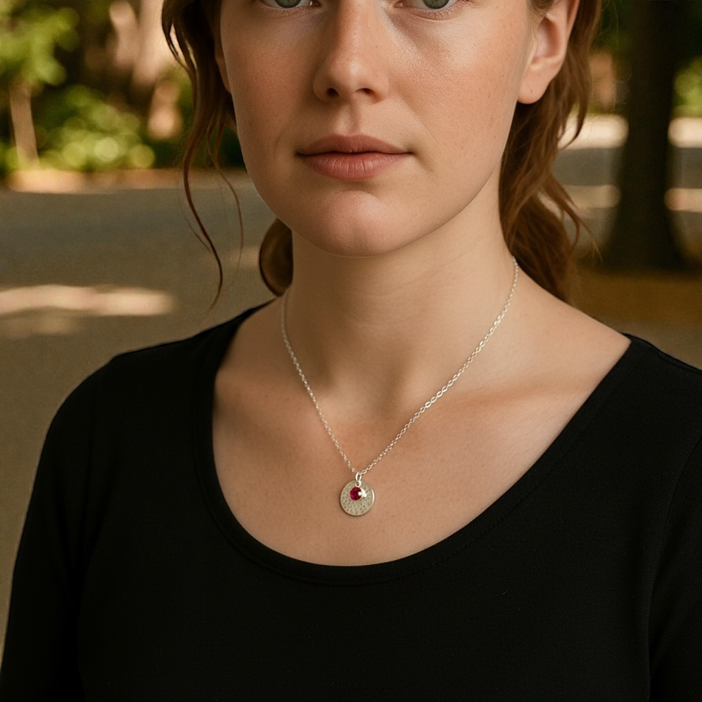 Minimalist Sterling Silver Disc Necklace with Ruby Charm