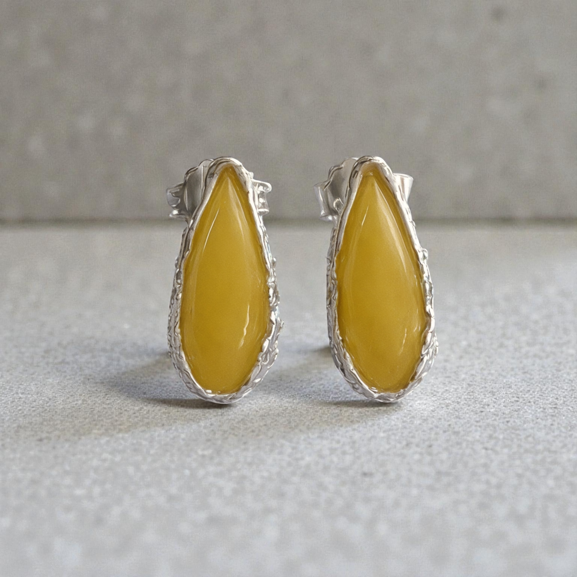 A timeless pair of sterling silver stud earrings featuring genuine teardrop-shaped Baltic amber in a warm yellow hue. Each stone is carefully set by hand, showcasing the natural beauty and soft, honey-like tones of the amber. Lightweight and easy to wear, these classic studs add warmth and elegance to any look — perfect for everyday wear or thoughtful gifting.