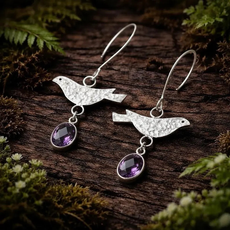 Crafted in solid 925 sterling silver, these gemstone dangle earrings are lightweight, comfortable, and beautifully balanced at 1.9 inches total drop. The hammered bird detail adds artisanal character, while the rich violet amethyst provides depth and contrast against polished silver.