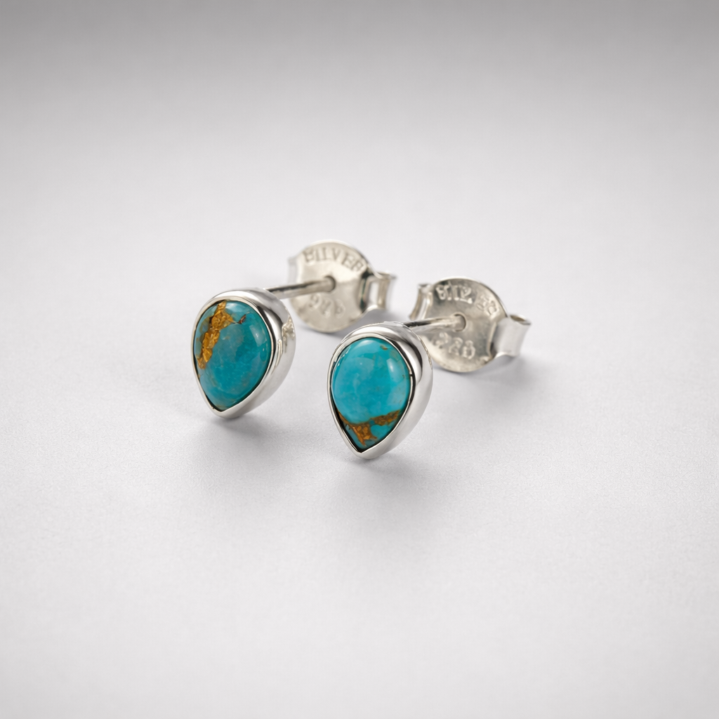 These elegant Blue Mohave Turquoise stud earrings are handcrafted in 925 sterling silver and set with striking teardrop-shaped gemstones. The vibrant turquoise tones, accented with natural copper veining, create a unique and eye-catching finish, ensuring each pair is one of a kind.