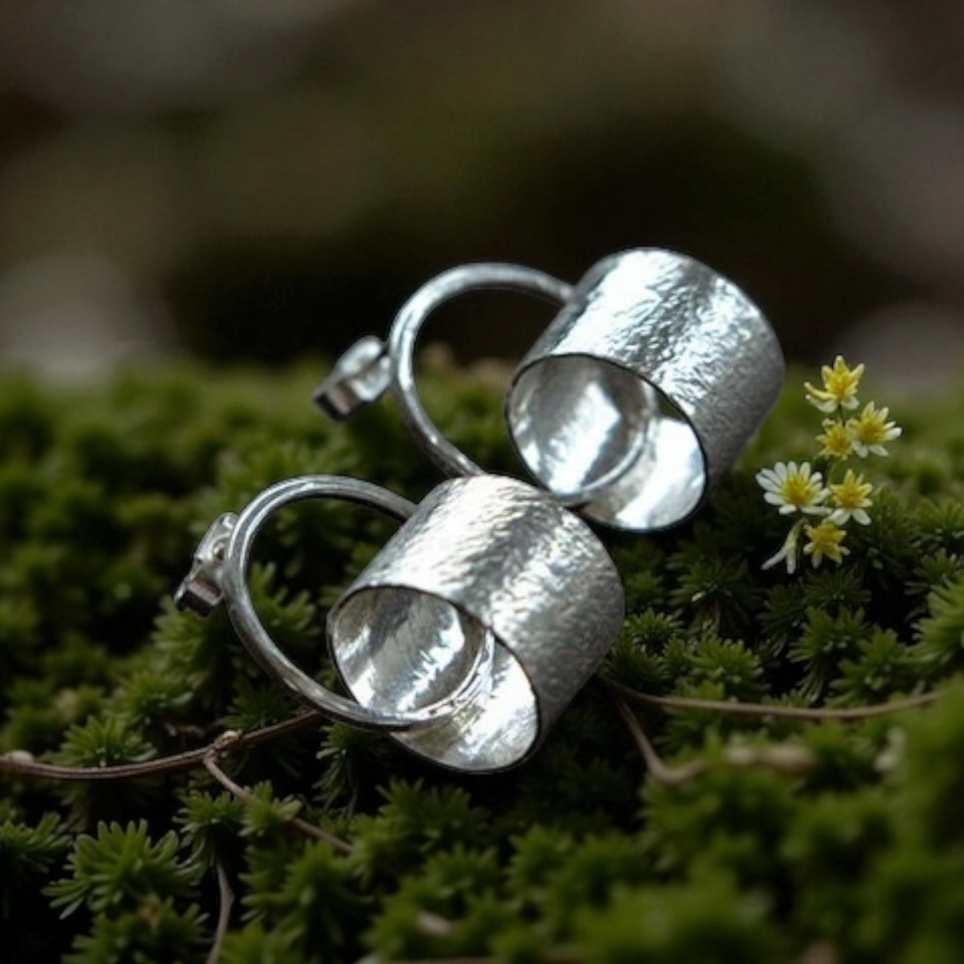 These contemporary circle stud earrings are entirely hand made in sterling silver. The wide ring was constructed of sterling silver sheet, curved, soldered and textured. The earrings were polished to a bright finish.