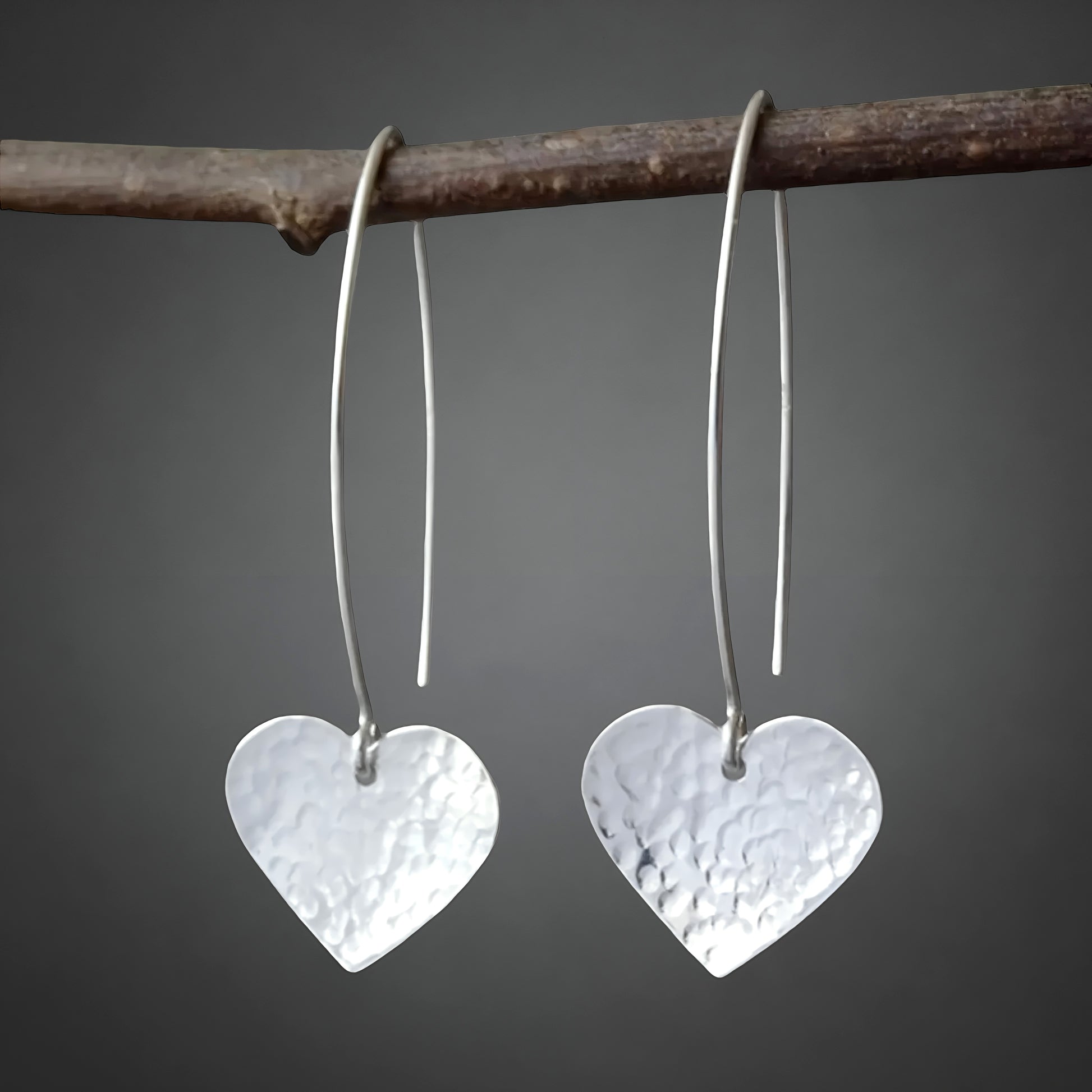Elevate your look with these elegant long sterling silver dangle earrings, showcasing a beautifully hand-hammered heart charm. These simple yet stylish earrings add a touch of sophistication to any outfit, making them perfect for both everyday wear and special occasions. An ideal gift for birthdays, anniversaries, or any celebration, these earrings are a timeless addition to any jewellery collection.