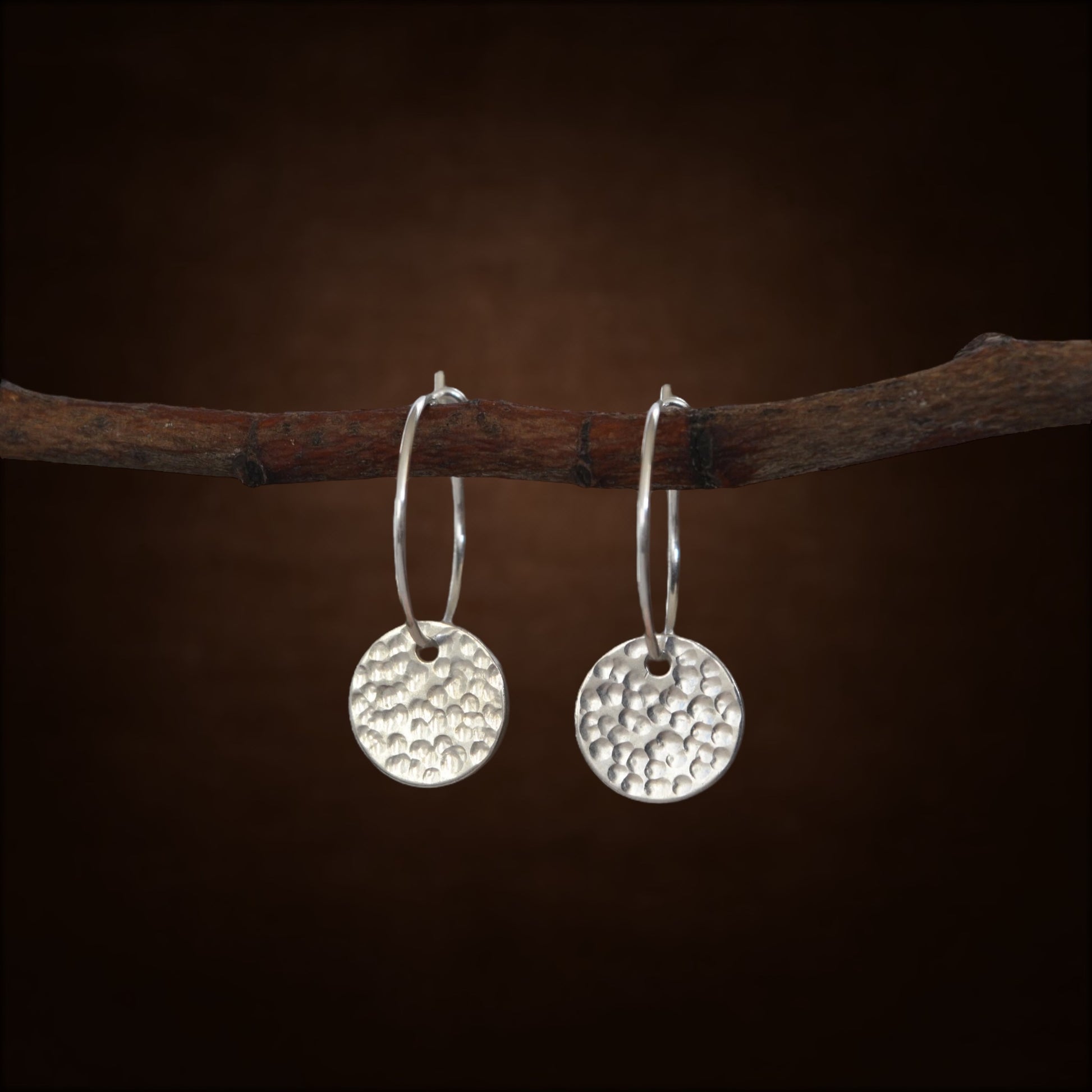 Minimalist sterling silver disc hoop earrings. The discs are hand hammered for a beautiful texture. These simple and elegant earrings are perfect for any occasion or for gift giving.