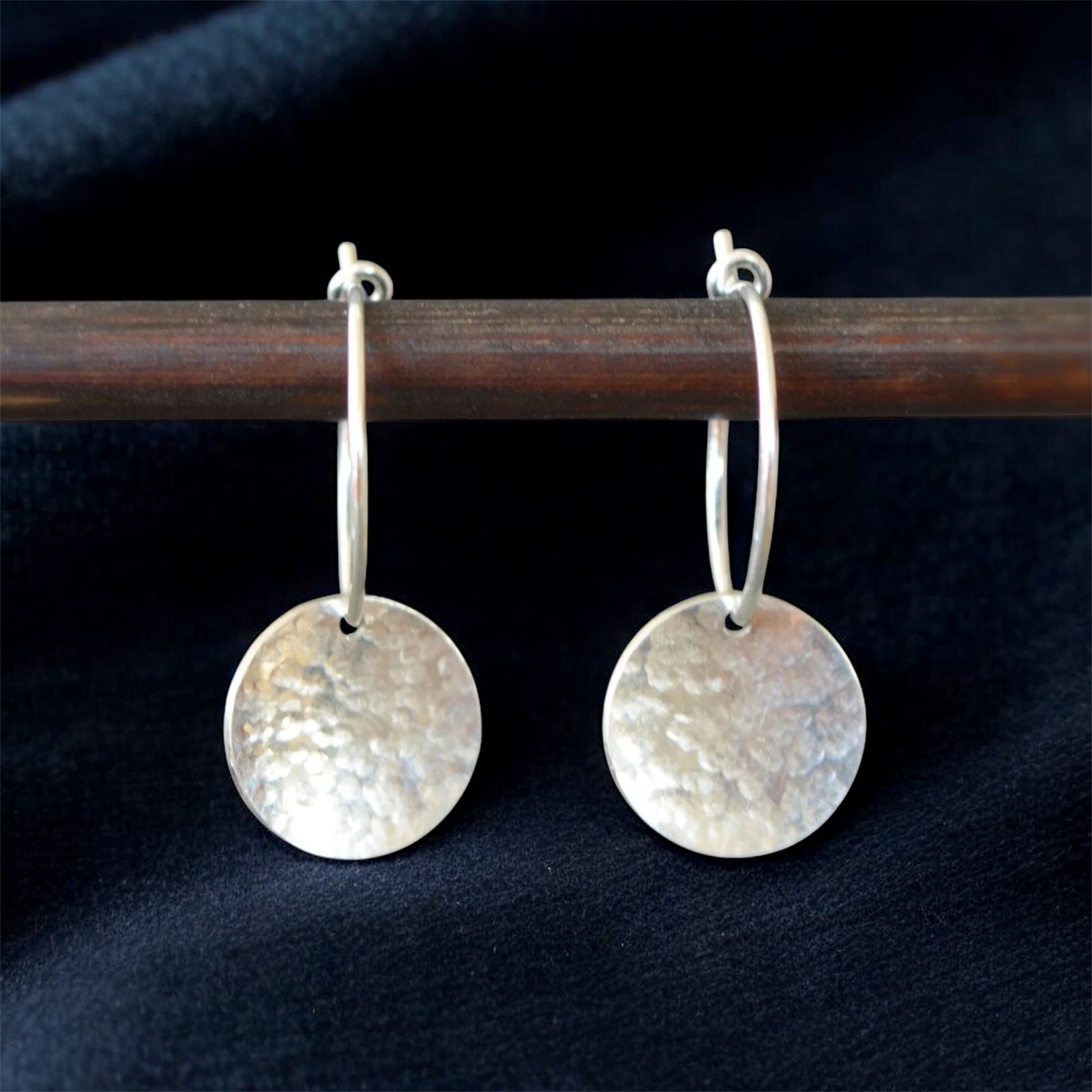 Minimalist sterling silver disc and hoop earrings. The discs have been hammered for a modern texture. These simple and elegant earrings are perfect for any occasion or for gift giving.